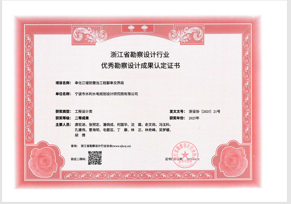 ●“奉化江堤防整治工程鄞奉交界段”獲浙江省勘察設(shè)計行業(yè)優(yōu)秀勘察設(shè)計”二等獎
